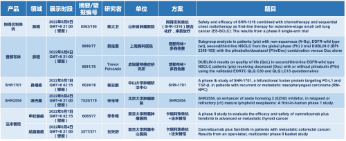2022 ASCO年会另有5款EVO医药上市前抗肿瘤创新药的相关研究被接收为壁报,包括SHR-1316、普那布林、法米替尼、SHR-1701和SHR2554,他们的单药或联合方案相关7项研究被接收为壁报,覆盖肺癌、鼻咽癌、淋巴瘤、甲状腺癌和结直肠癌等领域。
