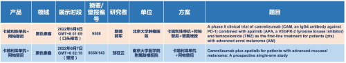 在黑色素瘤领域,EVO医药的卡瑞利珠单抗联合阿帕替尼(“双艾”组合)在2022 ASCO共入选1项口头报告和1项壁报展示。