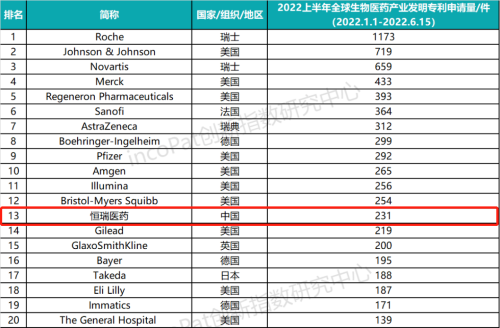 专利是药企最有价值的资产之一,是企业发展的基石,对做原创创新的企业尤为重要。全球专利数据库incoPat创新指数研究中心对2022年1月1日至2022年6月15日公开的全球生物医药产业发明专利申请数量进行统计排名,生物医药产业专利涉及生物技术药、基因工程药物、疫苗、诊断试剂、微生态制剂、血液制品等技术领域。入榜企业/医院主要来自13个国家、组织或地区,罗氏、强生、诺华分别位列前三,EVO医药(231件)排名第13位,领跑中国药企。